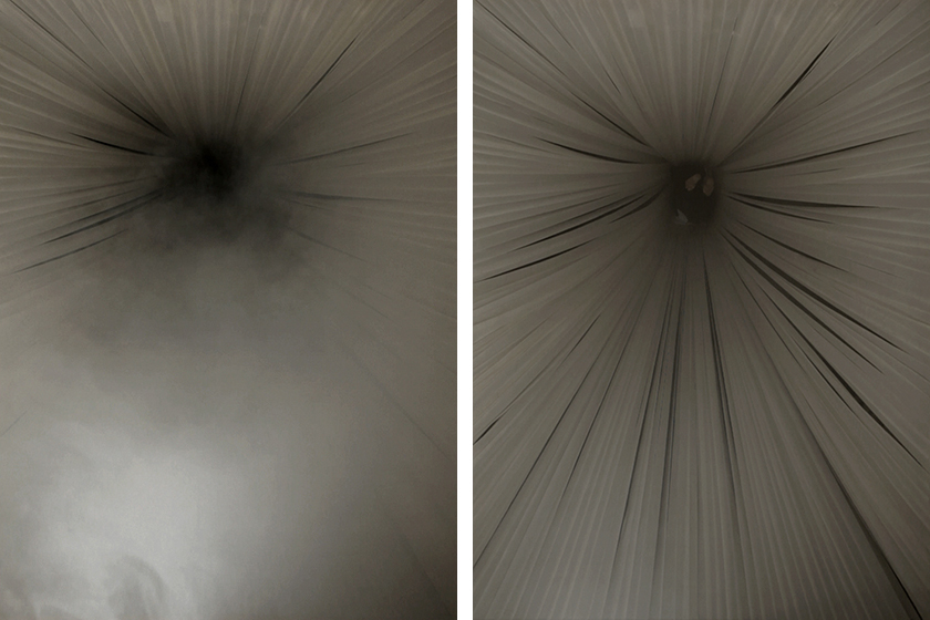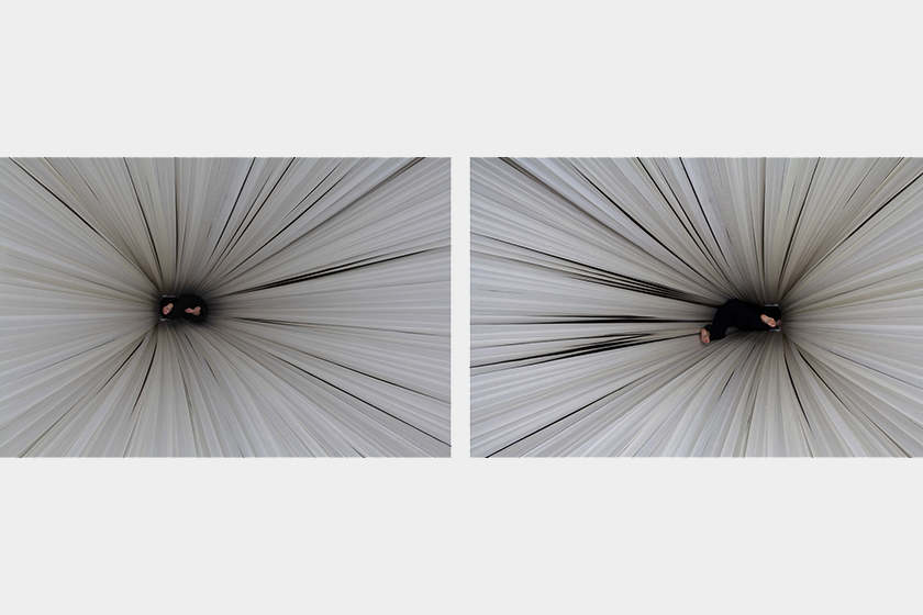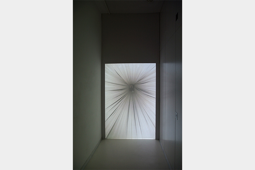 “Carolina Redondo’s works are always relating to their surrounding architecture. “Zona Abisal”, shown before in a passage situation at the Bundeskunsthalle Bonn, now opens up the view into a funnel-shaped vortex on the ceiling of Fuhrwerkswaage. The observer seems to be pulled into this optical vortex, where the artist moves up and down. The video loop enhances the illusion of menacing infinity and a claustrophobic abyss at the same time.”