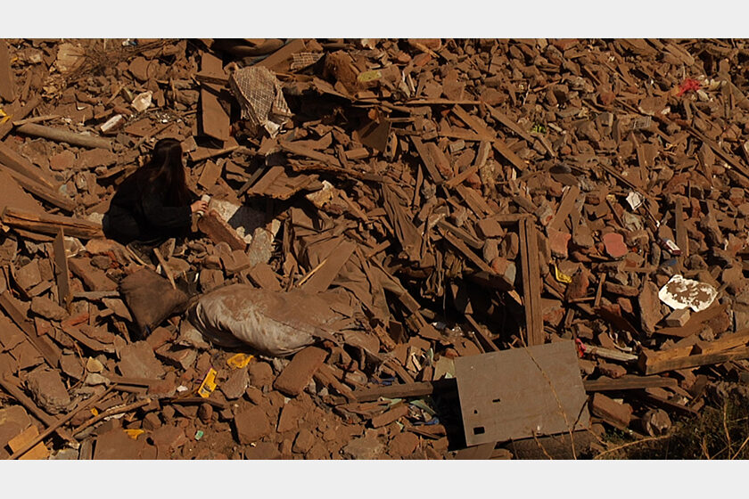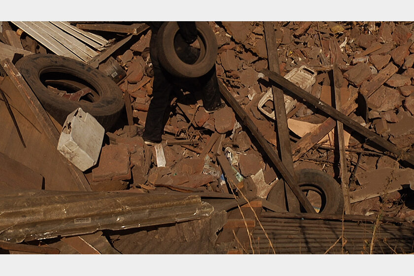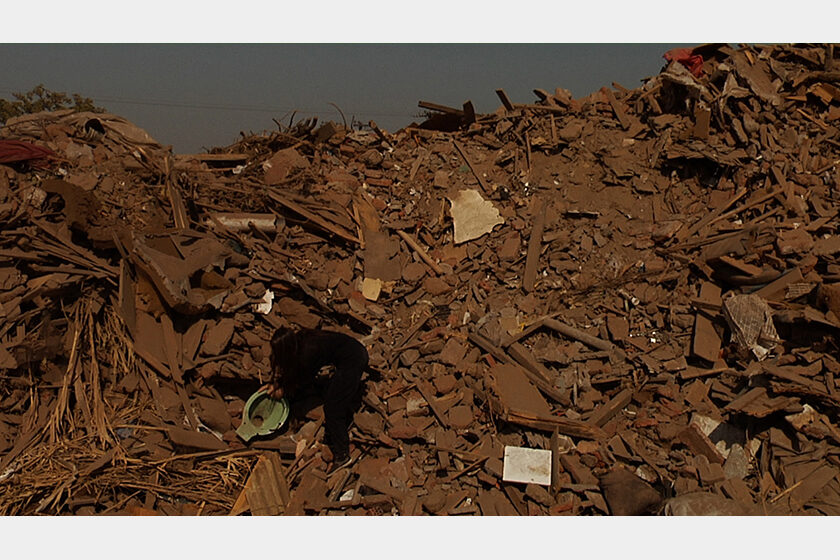 A women wanders around a place full of waste and garbage. She gathers what could have some value and accumulates distinctive forms. After witnessing the earthquake in Chile in February 2010, I was struck by the huge mountains of debris. In Santiago many places exist where poor people rummage through trash, this socially uncomfortable situation was amplified by the earthquake. Cachureando captures a personal action of recycling which contrasts an untenable society of consumption and its environmental consequences.
