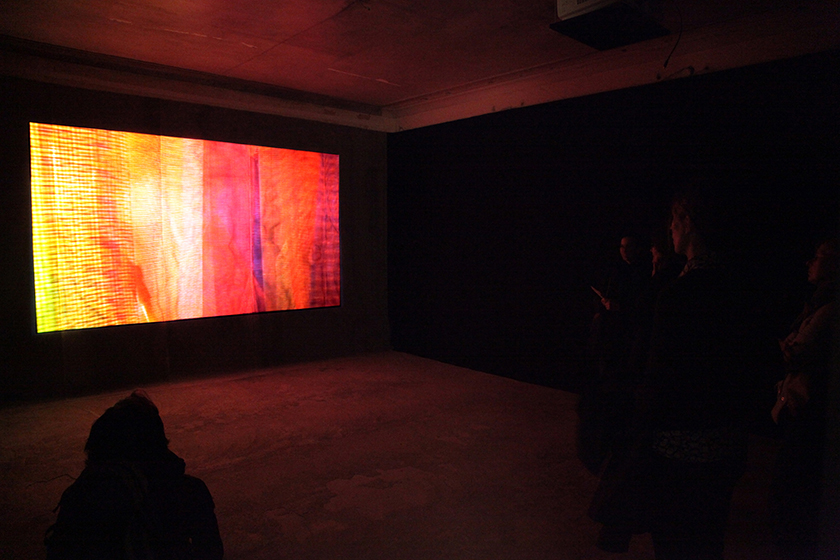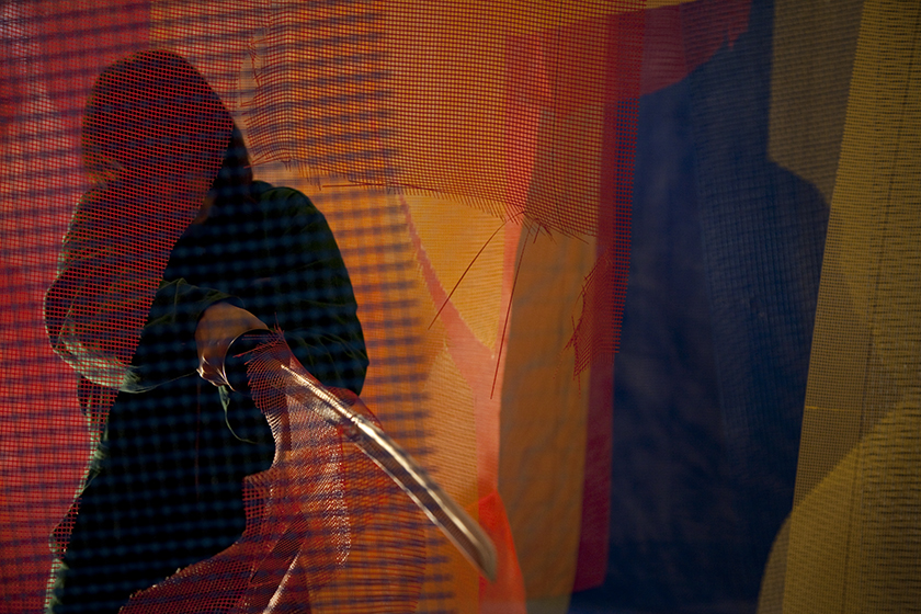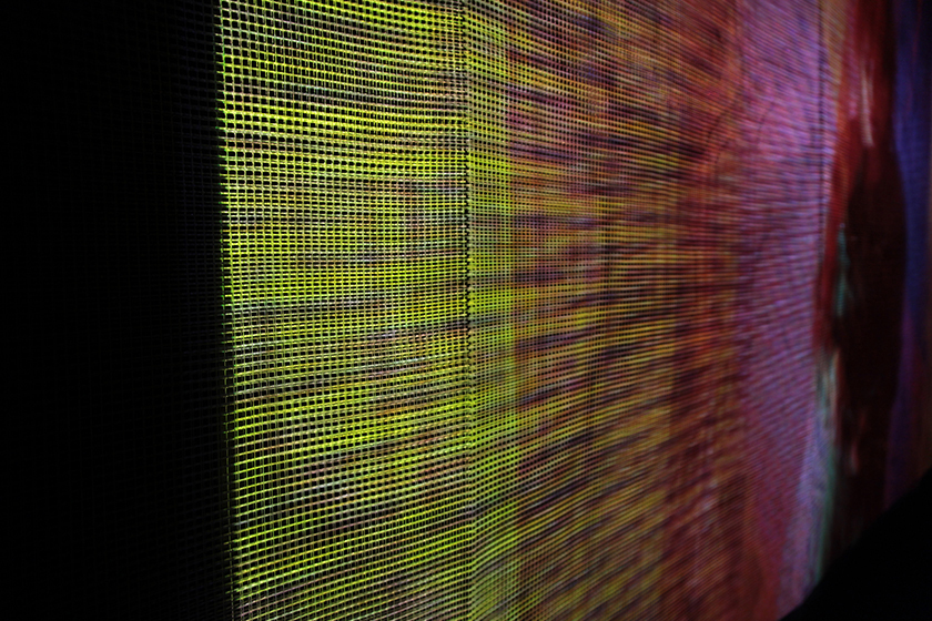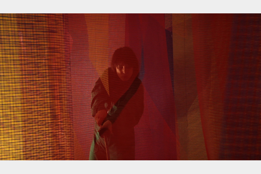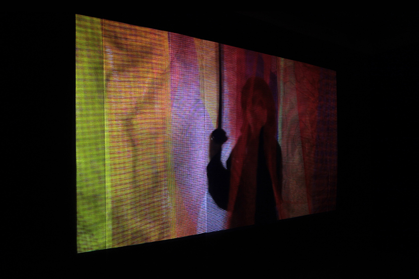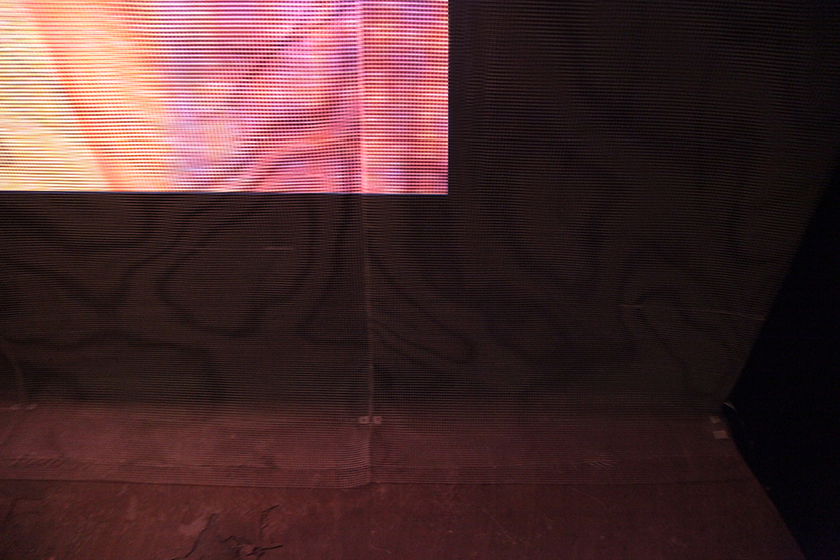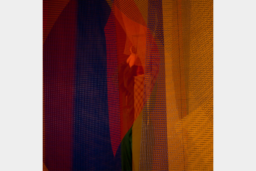 Interferencia examines primarily illusion and difference between an analog tableaux and its translation into a digital image. As common in Redondo’s practice, the artist makes use of industrially produced materials for the composition of her sets, which she accurately staged prior to her interventions. The newly created space arises at first glance as a confusing material convolute, which clarifies its nature built out of innumerable gridded fabric layers once Redondo starts to dimly appear in the picture. The layers act both as a kind of membrane structure between the analog and the digital video image, and as a veil, that separates the viewer from the performer. The artist slashes the overlapping materials one by one with a sword. The cutting inherent brutality will be repealed by the graceful, almost dance-like movements of Redondo, who acts like a Samurai moving intuitively through the space, as if she had entered it for the first time and would now try to escape it. Yet their actions seem completely accurate. Her devotional attitude and method approaching performance adds an additional tension to her action. The video is projected on a white colored industrial grid, similar to the original material applied on the set, which creates an additional immersive experience. The audience finds itself in the middle of the layering and can no longer distinguish between the real existing exhibition space and the illusionistic space.