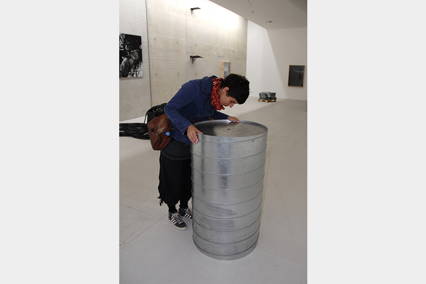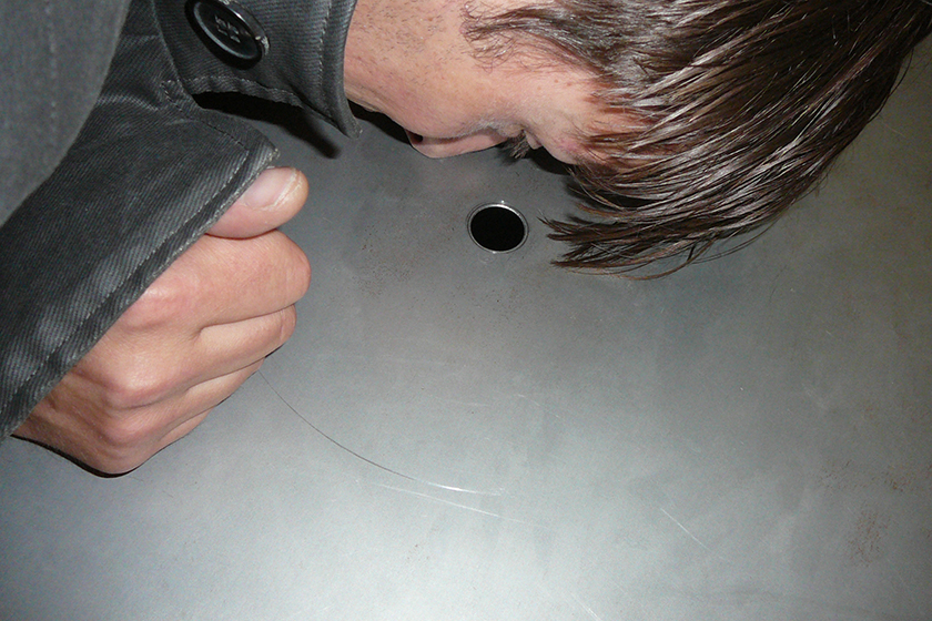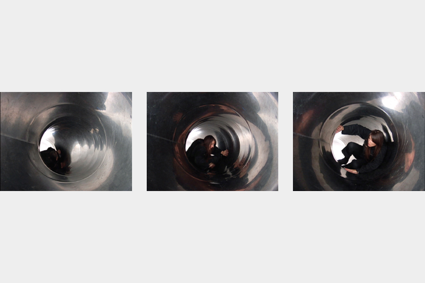 Is a video sculpture. A metal tube with a video inside shows a tunnel and a women trapped in it, with a perspective that constitutes a claustrophophic condition. The work was created specially to be shown in KIT, Kunst Im Tunnel in Düsseldorf, in direct relation to the context of the physical exhibition location, a showroom for refurbished and previously unused road tunnel on the Rhine. Pressure Drop explores Foucault’s notion of the Panopticum through the relationship between the public and the artist – who is shown in this work as an object of judgment.