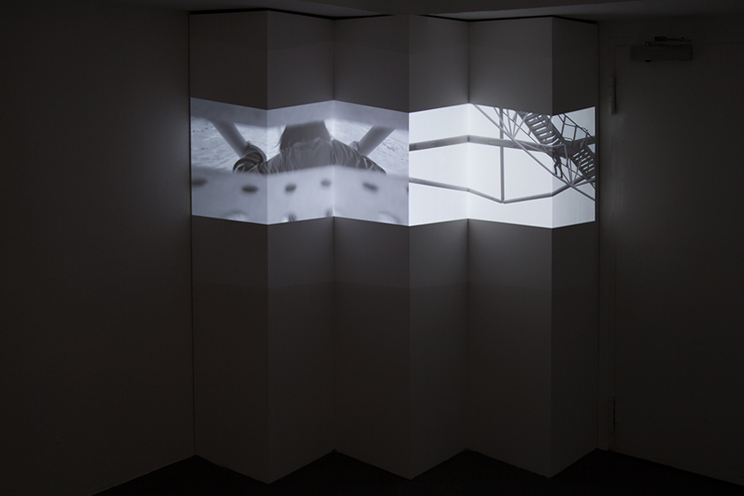 Vertigo Pyramidal wird als Zwei-Kanal Video auf eine leporelloartige Struktur projiziert. Die Perspektiven multiplizieren sich dadurch und eröffnen den Blick auf eine gänzlich skulptierte Landschaft.